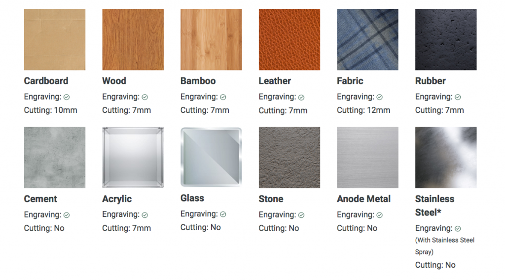 Los usuarios pueden modelar, cortar y grabar sobre una amplísima gama de materiales, incluyendo madera, cuero, acrílico, tejidos, cartón, acero inoxidable, metal anódico, cristal, cemento y muchos más.