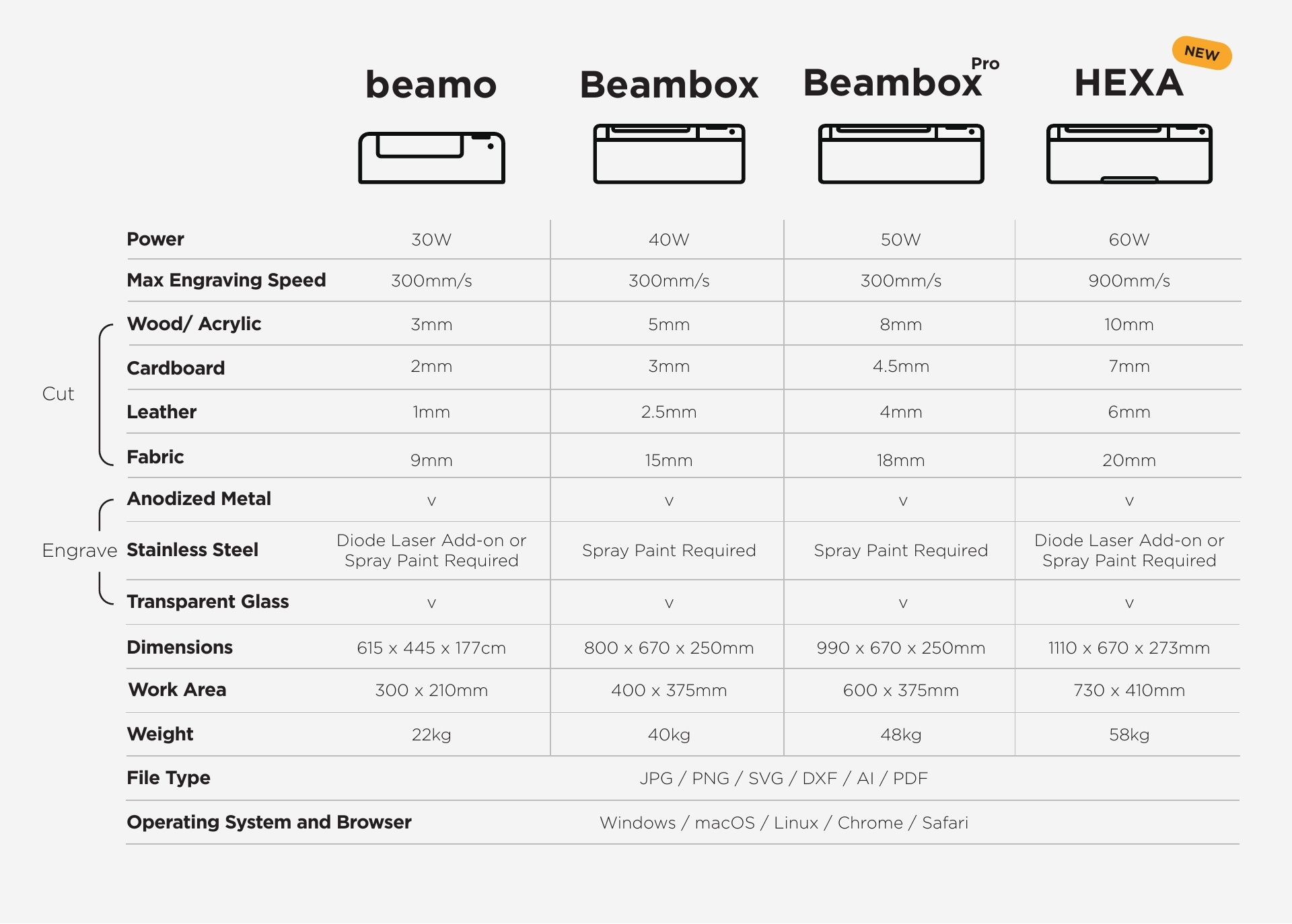 Hay un aumento del 33 % en la dimensión de trabajo de FLUX HEXA en comparación con FLUX Beambox Pro
